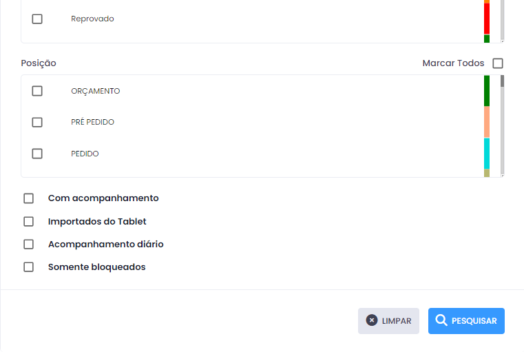 Ao selecionar as checkbox, terá duas opções a seguir, Limpar ou Pesquisar, no qual, caso seja clicada a opção Limpar, todo o filtro será excluído, e caso a opção Pesquisar seja clicada, o sistema irá filtrar pelas seleções especificadas.