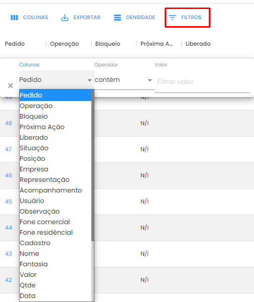 → A opção coluna, no qual apresenta informações como pedidos, operações, bloqueios, entre outros
